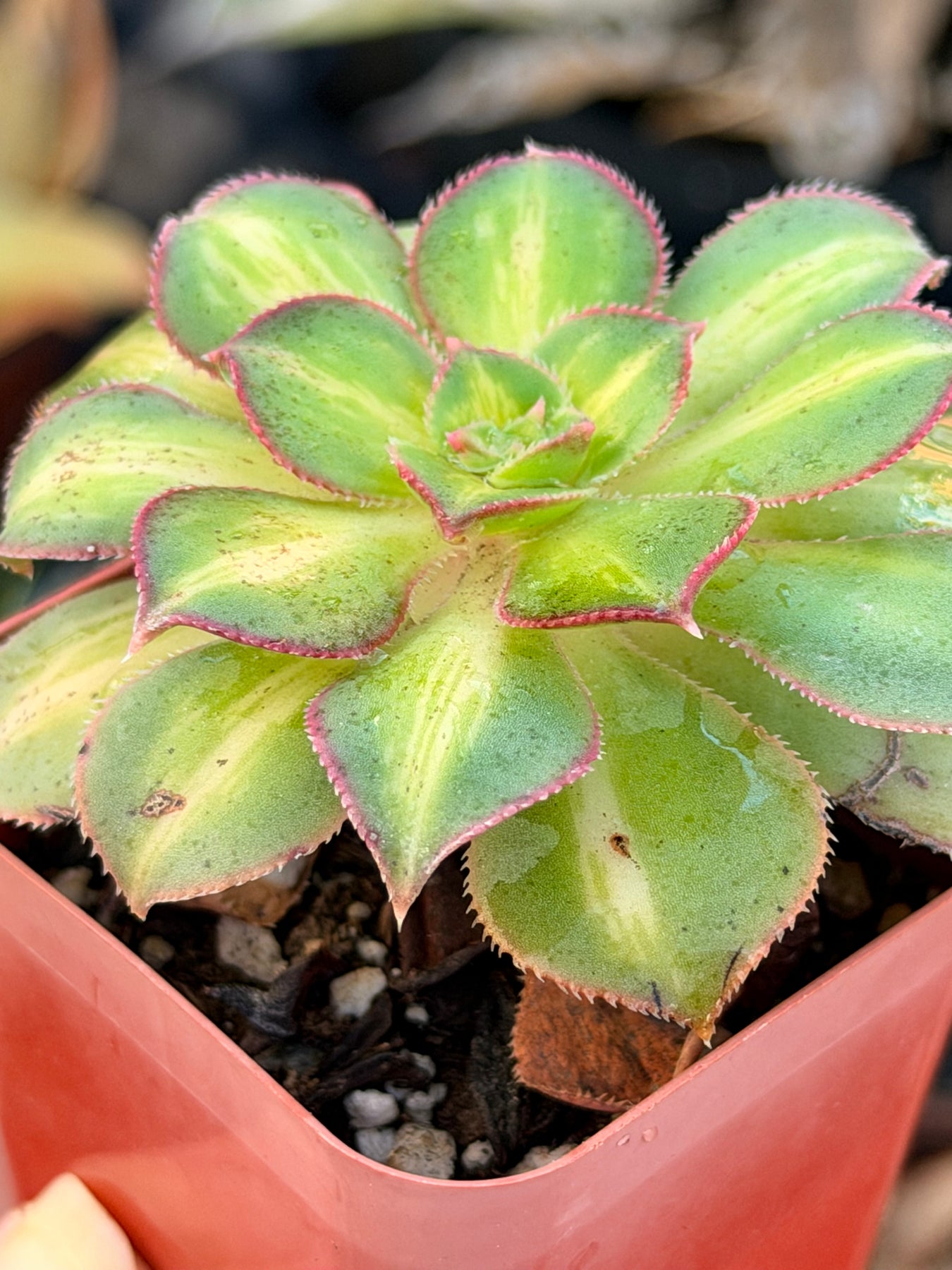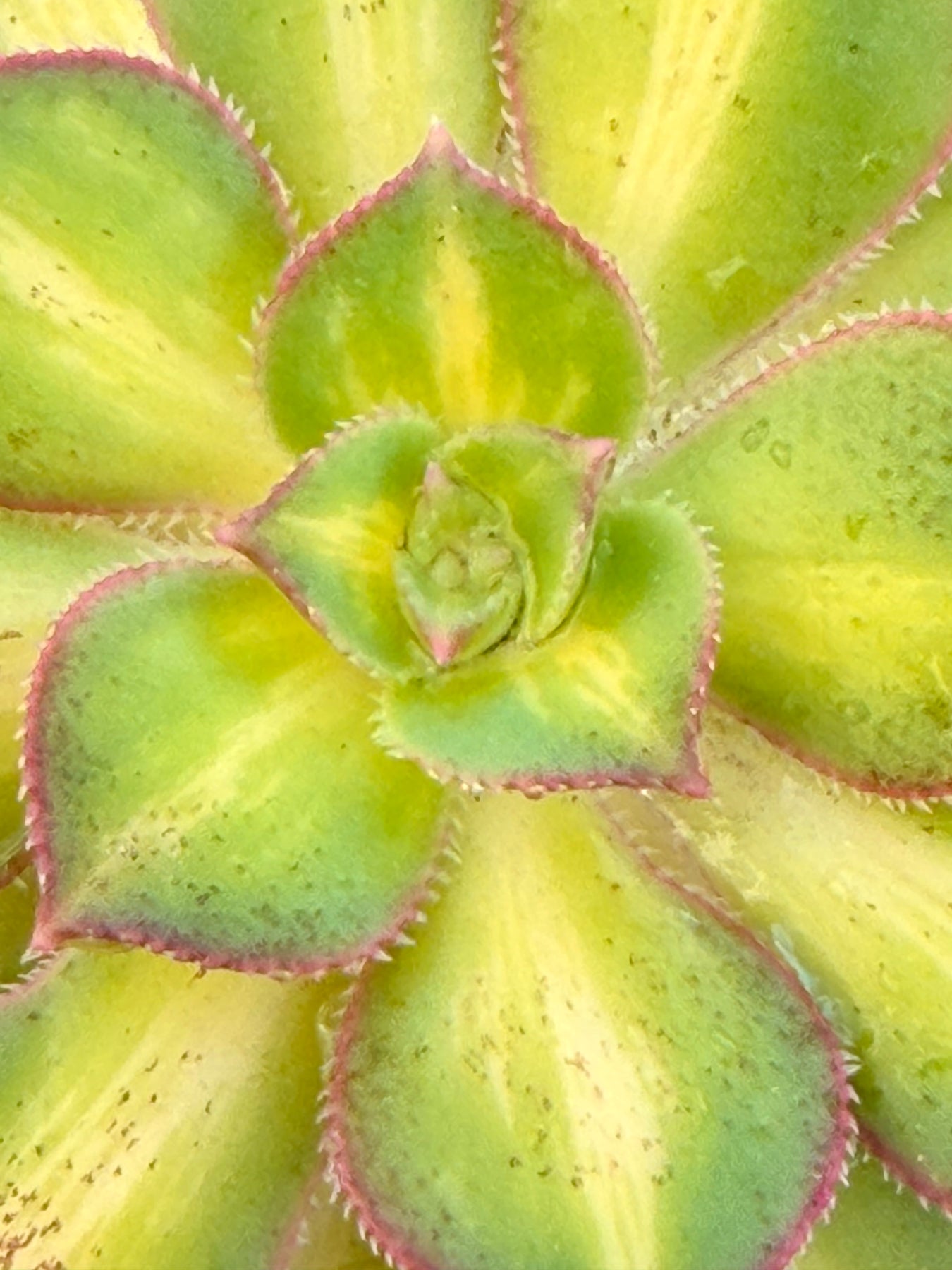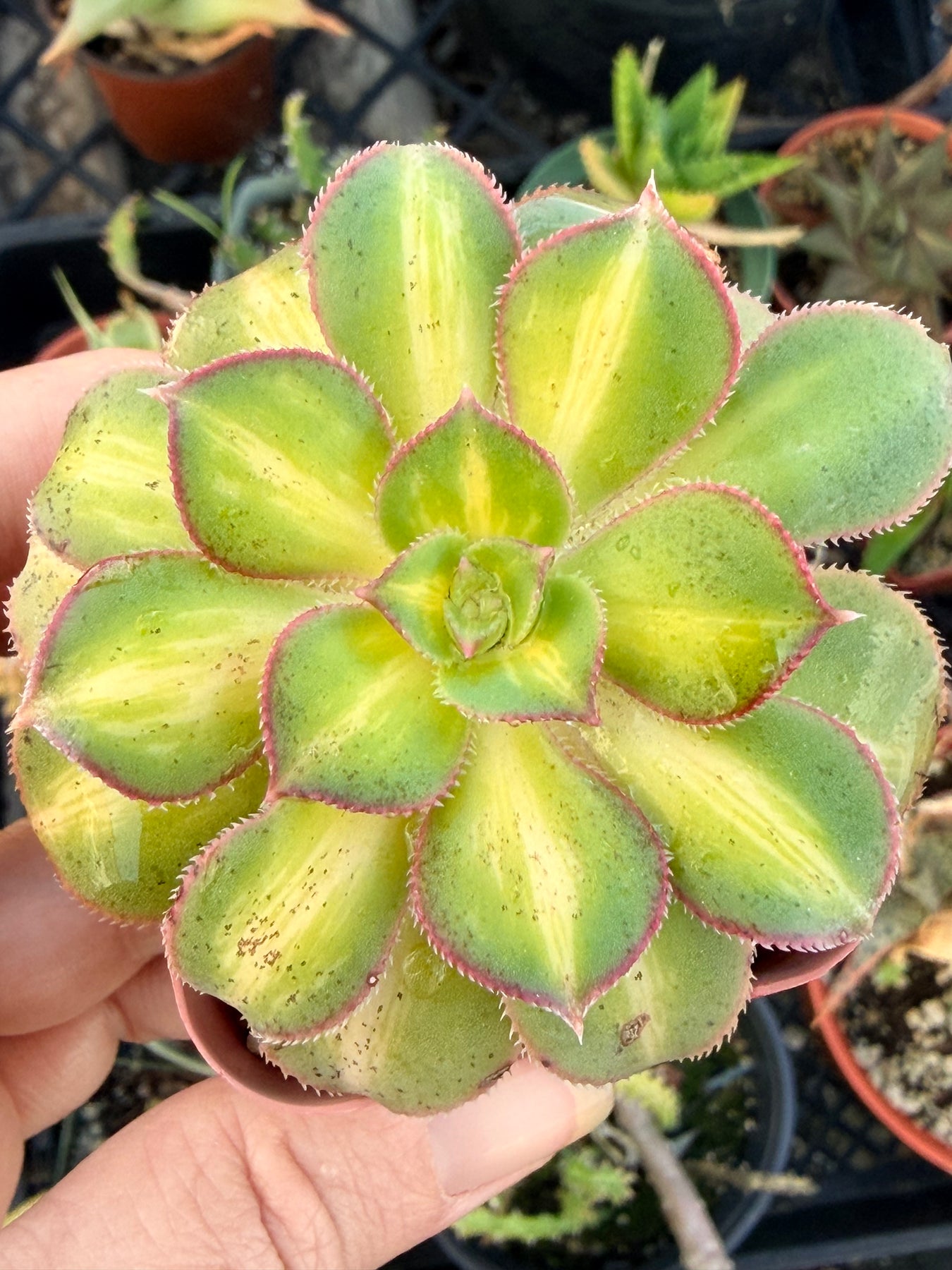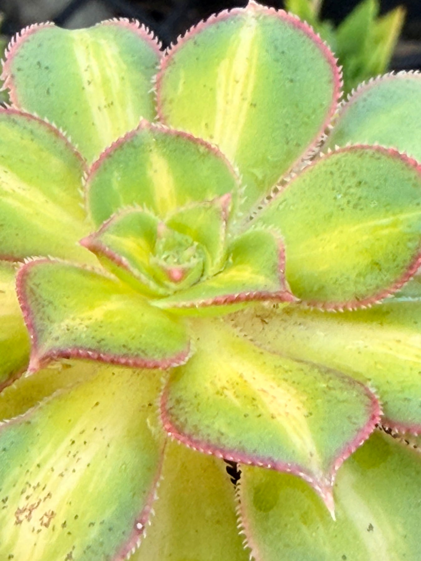 This rare Aeonium 'Starburst' succulent has a stunning variegation, with green coloration on the margins and light yellow centers, which makes this succulent a hard-to-find type of Aeonium plant. So cool! Great rock garden plant, perfect for DIY succulents.