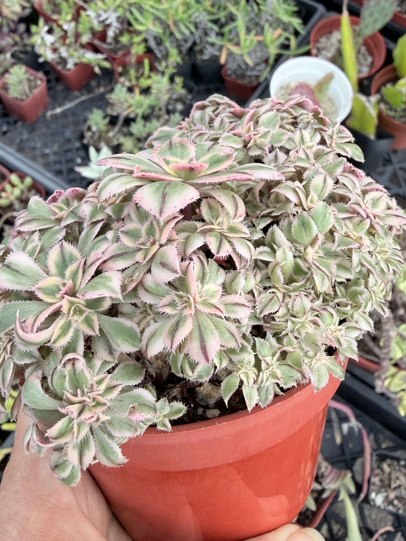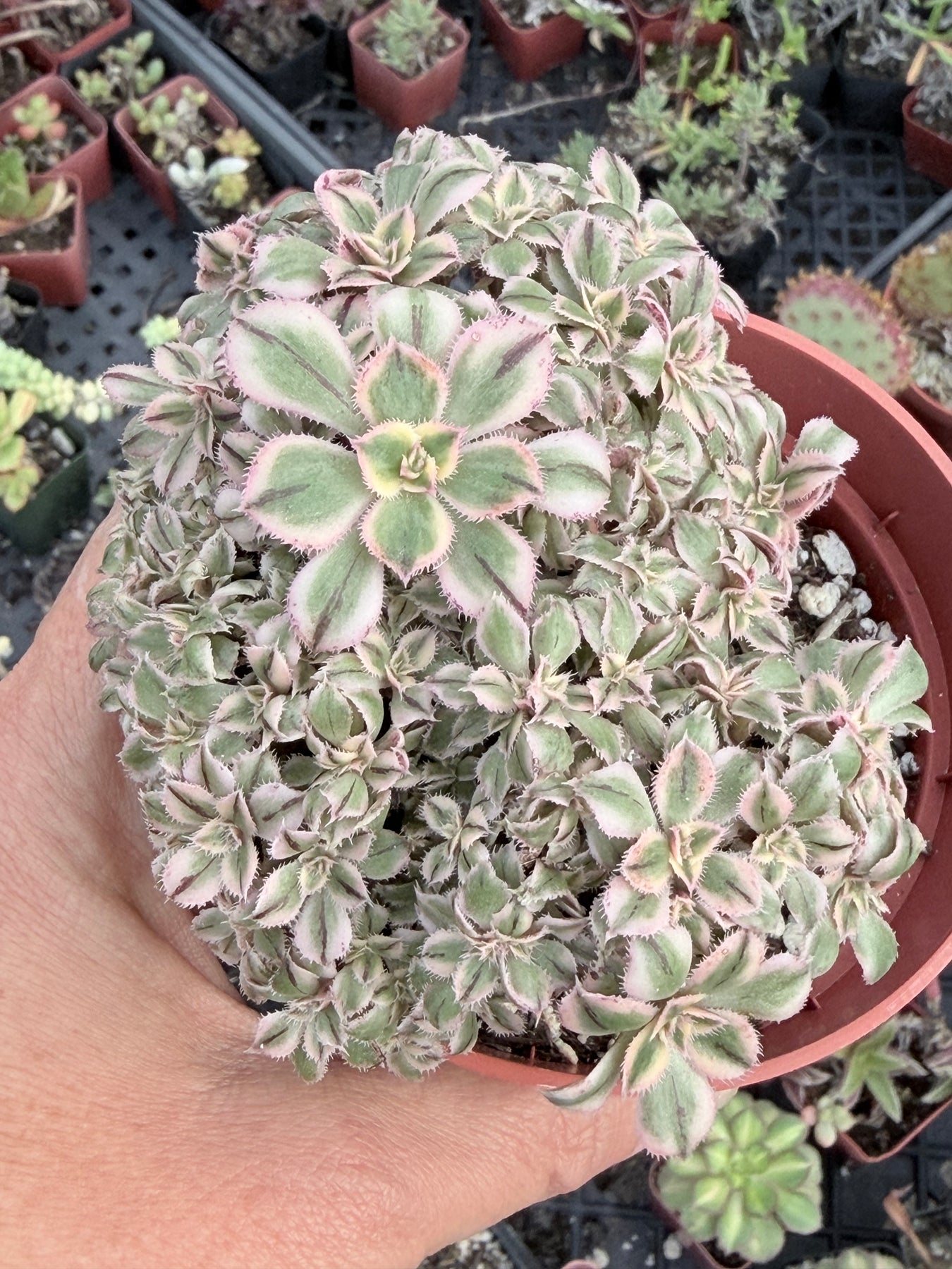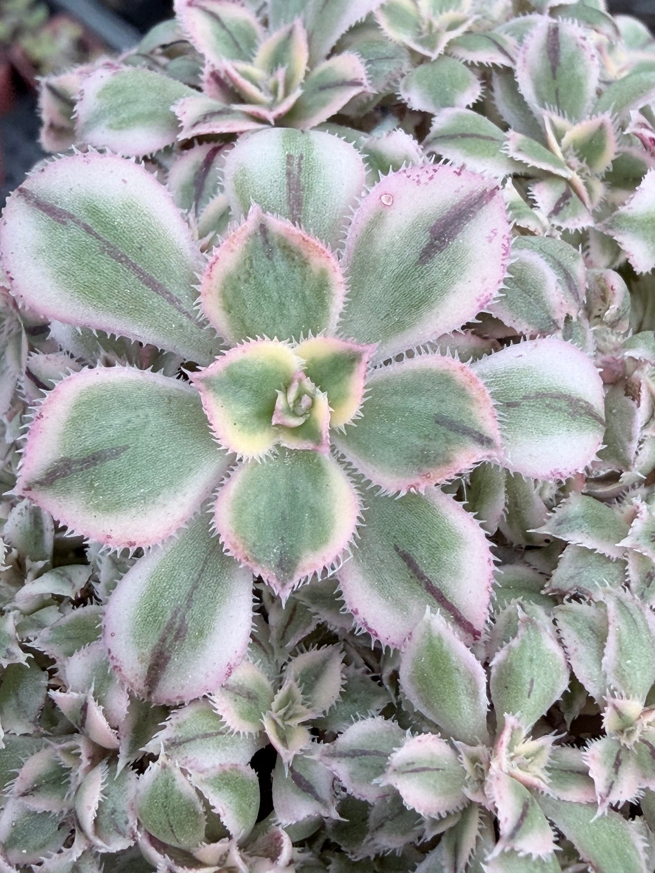 These are beautiful cresting Aeonium succulents with unusual coloration for a 'Sunburst' variety. It has the typical variegated yellow and green leaves, but also a small dark stripe on the center of each leaf. They get bright pink margins when blushing.