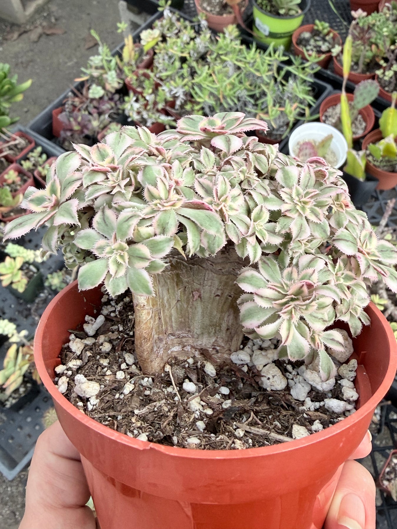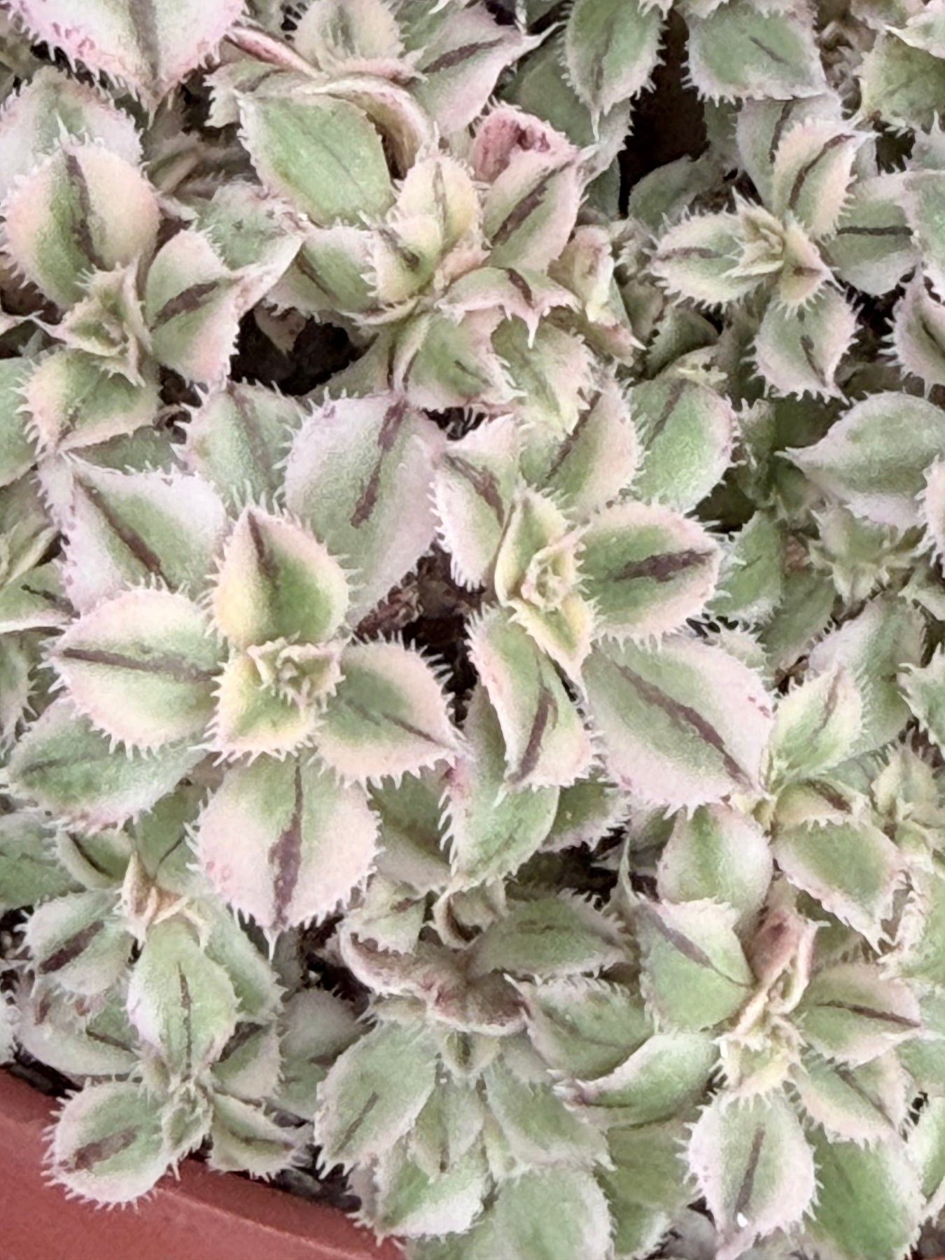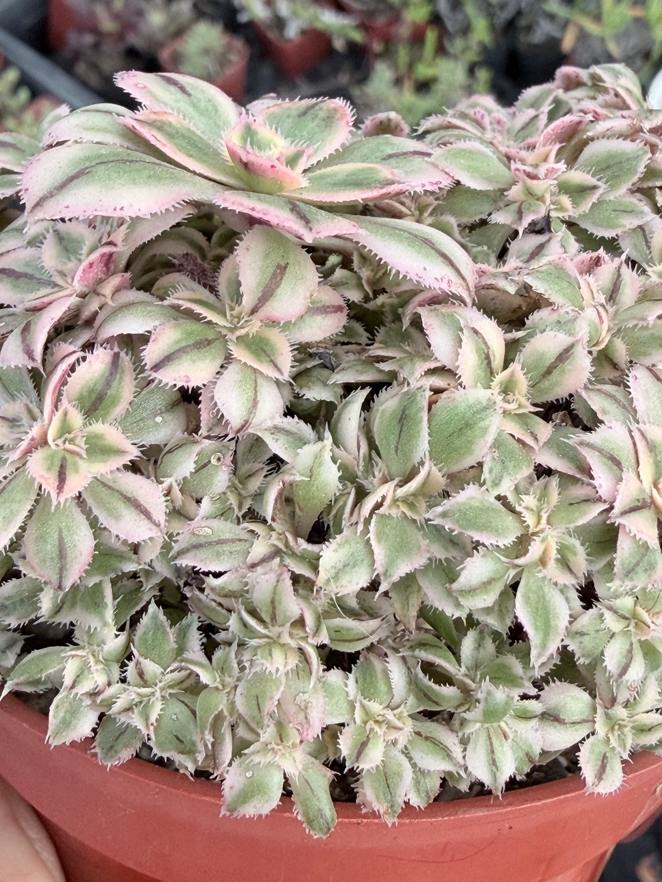 These are beautiful cresting Aeonium succulents with unusual coloration for a 'Sunburst' variety. It has the typical variegated yellow and green leaves, but also a small dark stripe on the center of each leaf. They get bright pink margins when blushing.