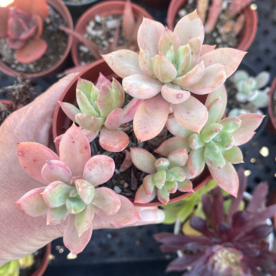 This is a gorgeous pastel cluster of a Pachyveria hybrid. It’s a very unique succulent plant. Leaves are plump with pink and teal coloration. This easy-care plant is shown in 4" pot.
