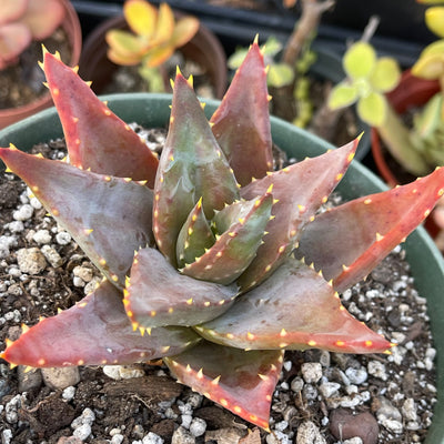 Aloe distans ‘Jewelled Aloe’ is a rare succulent plant with gold teeth. It is a crawling succulent which forms long columns and sprawls up and over rocks as it grows. This Aloe takes on varying jeweled shades under stress.